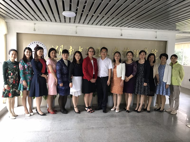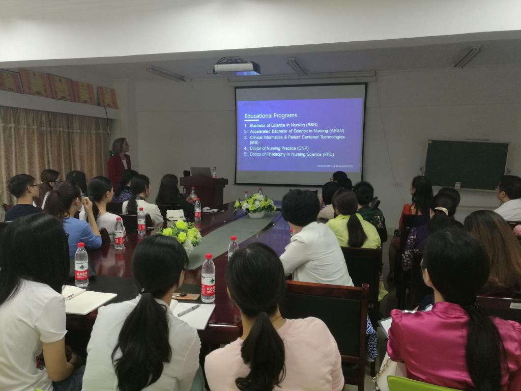 2017年9月5日我院海外名师美国华盛顿大学Basia教授在我院会议室举行《美国华盛顿大学的护理与科研》的讲座。会议由我院陈偶英教授主持,我院罗尧岳院长,研究院附属医院陈燕院长,彭小玉主任,夏爱明主任,黄静副主任,湖南省儿童医院朱丽辉副院长,中医附一护理部冯进、廖若夷副主任,何亚娜、彭廷云护士长,我院潘晓彦教授,李东雅副教授,青年教师及研究生参加了此次会议。