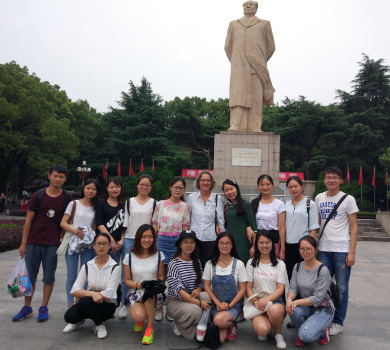 我院研究生陪同Basia教授来到东方红广场,一同瞻仰毛主席雕塑,并在毛主席雕塑下合影留念。随后美国华盛顿大学Basia教授在大家的陪同下参观游览岳麓书院、爱晚亭等著名景点,我院研究生热情的用英语为Basia教授进行景点介绍,Basia教授在步行上山途中与同行的研究生们相互交流分享,在游览中还询问了每一位护理研究生“为什么会选择从事护理工作”,大家也踊跃的说出了自己的想法和职业规划。