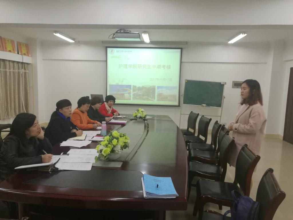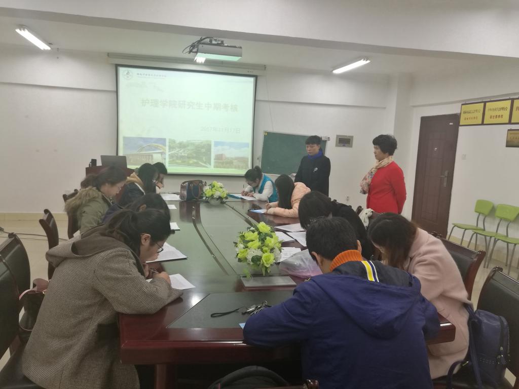2017年11月17日上午,我院2015级护理硕士研究生中期考核在学院会议室进行,本次学院中期考核分为专业英语考核和面试考核。2015级10名护理硕士研究生进行了考核,学院易霞教授、陈偶英教授、潘晓彦教授、蒋小剑教授、李东雅教授参加了考核。
