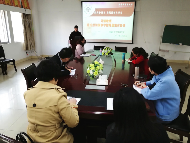 2018年3月23日上午,内科护理教研室在学院会议室举行外请教师理论授课前教学指导暨集体备课教研活动。本次教研活动由学院副院长、内科护理教研室主任陈偶英教授主持,学院教学督导小组全体成员,内科护理教研室外请教师杨硕博士和刘湘华老师参加。