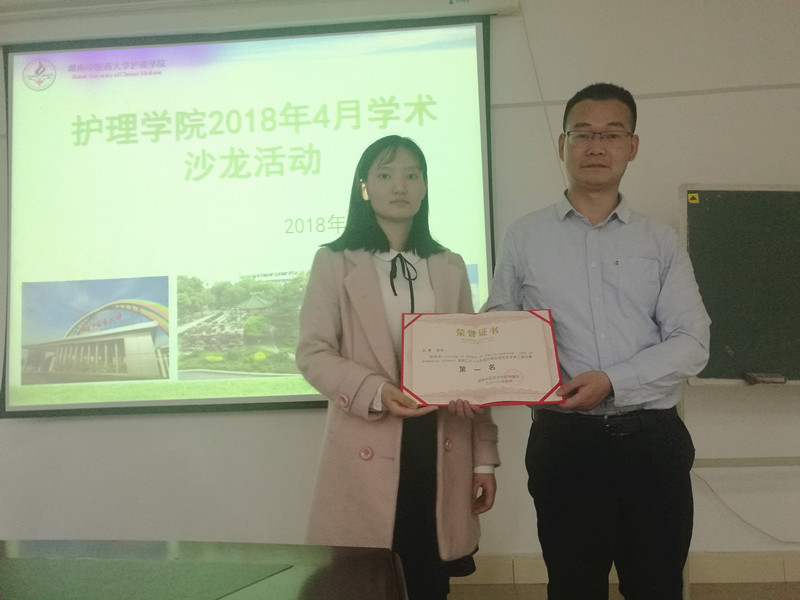 本次学术沙龙三位主讲分别是湖南省纬度信息科技有限公司的技术讲师夏建辉和学院两位研究生方森、孙静。夏建辉老师以《了解核心期刊,挖掘数字资源》为题给我们分享了一个科研利器:spischolar学术资源在线。这个集学术期刊指南与学术搜索为一体的资源网站,夏老师详细的讲解了spischolar学术资源的使用方法和技巧,特别是外文文献的查阅,功能强大,覆盖面广。我院2016级研究生方森和2017级研究生孙静分别作了主题为《品味药茶》和《Review of effect of family-centered care on premature infants》的PPT汇报,他们查阅大量的文献,分享了各自研究领域的新知识新进展,科教科朱正刚老师对他们的汇报作了点评,颁发了荣誉证书。