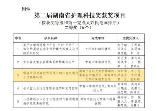 近日,湖南省护理学会公布了第二届“湖南省护理科技奖获奖项目”。我院团队负责的“喉癌术后患者创伤后成长的心理机制及干预策略研究”项目,经形式审查、专家评审、评审委员会审定、项目公示等程序,荣获第二届湖南省护理科技奖二等奖。