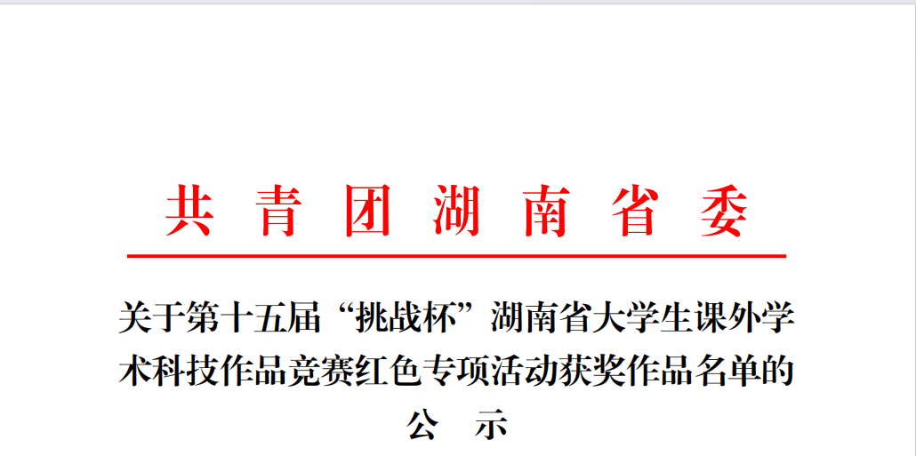 大赛自今年三月正式启动以来,得到全省各高校的积极响应,吸引了超过100所高校的10万余名师生积极参与,600余件优秀作品推报省赛。我院团队历经校初赛、复赛、决赛三个阶段,从上百个项目中脱颖而出进入省赛,通过反复雕琢,精益求精,最终经“挑战杯”红色专项活动省级评委组评审,2023年9月6日,竞赛组织委员会将《第十五届“挑战杯”湖南省大学生课外学术科技作品竞赛红色专项活动获奖作品名单》予以公示。