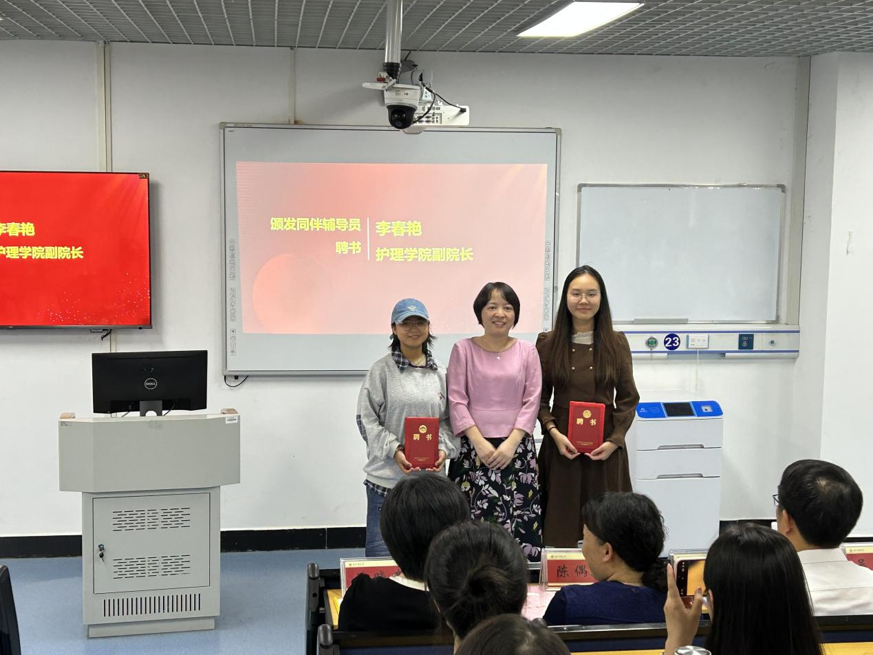 随后李春艳副院长给2023级新生同伴辅导员何素素和谭碧璨颁发同伴辅导员聘书,鼓励两位同学充分发挥同伴辅导员的作用,了解新生的需求和挑战,并与他们建立积极的互动和关系,为新生提供帮助和支持。