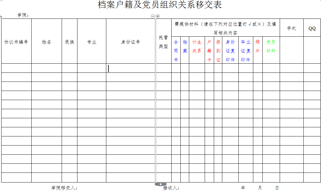 注:托管档案需要移交的材料为蓝色字体的材料;托管档案户口需要移交蓝色字体及红色字体的材料;托管档案及组织关系需要移交蓝色及绿色字体的材料;三者都托管的,需要移交上述所有材料。个人信息及手机号码,QQ信息需要填写完善。谢谢!