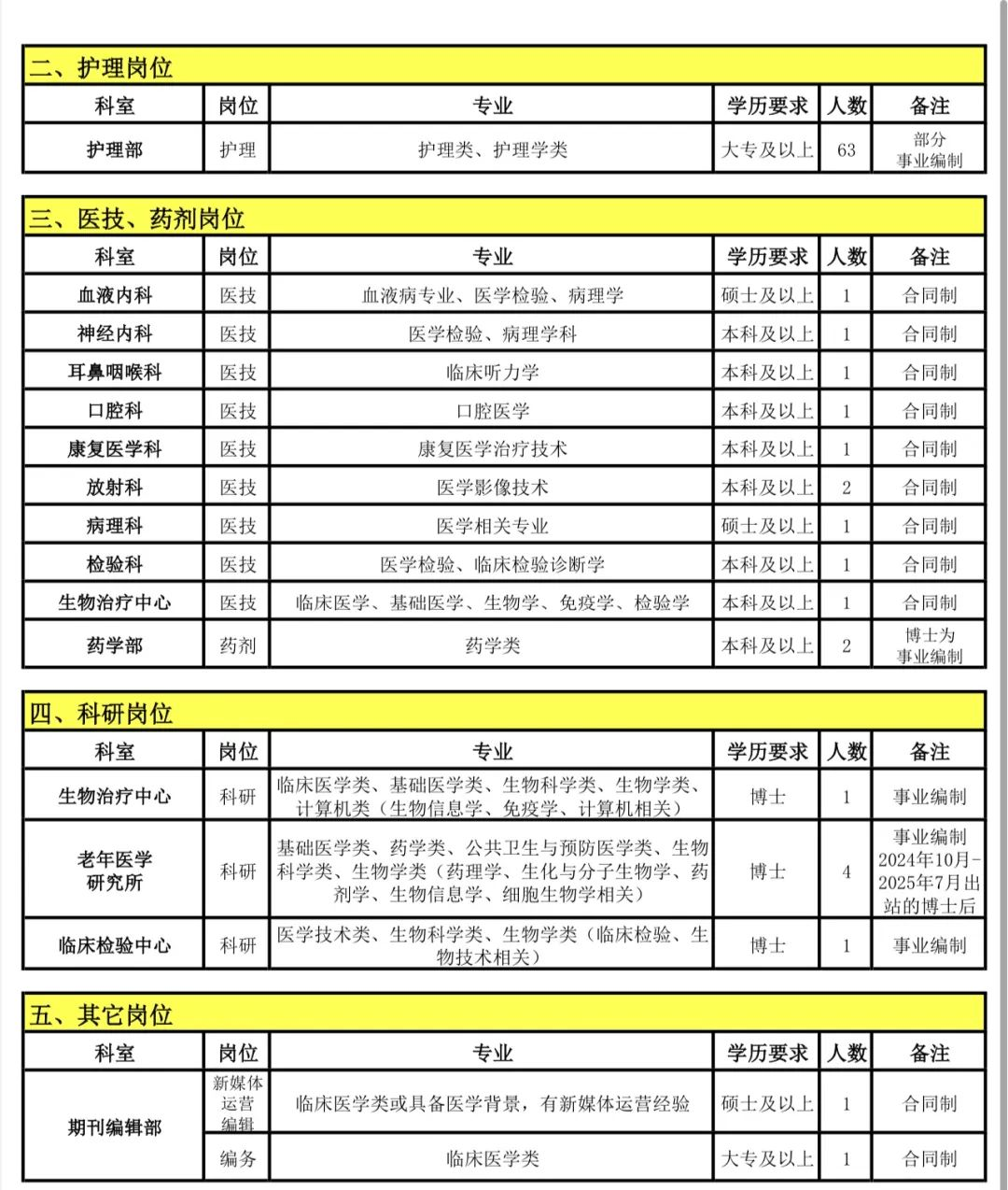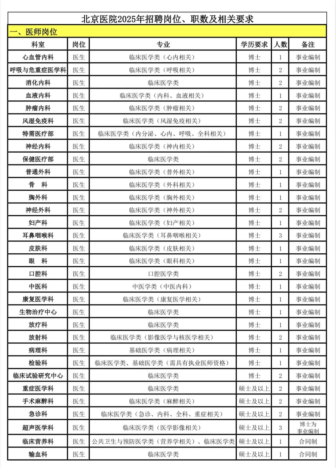 北京医院始建于1905年,是直属国家卫生健康委员会的三级甲等医院和国家主要的医疗保健基地,也是国家老年医学中心和国家老年疾病临床医学研究中心。医院在老年病的医疗、保健、护理、康复、预防等方面成绩显著并形成了自己的特色。为进一步加强医院学科队伍建设,充实医院人才队伍,根据医院学科发展需要,结合医院实际工作情况,现面向2025年应届高校毕业生及出站博士后公开发布招聘信息,竭诚欢迎有志于医疗、科研事业发展的各类人才加盟我院,共筑辉煌。