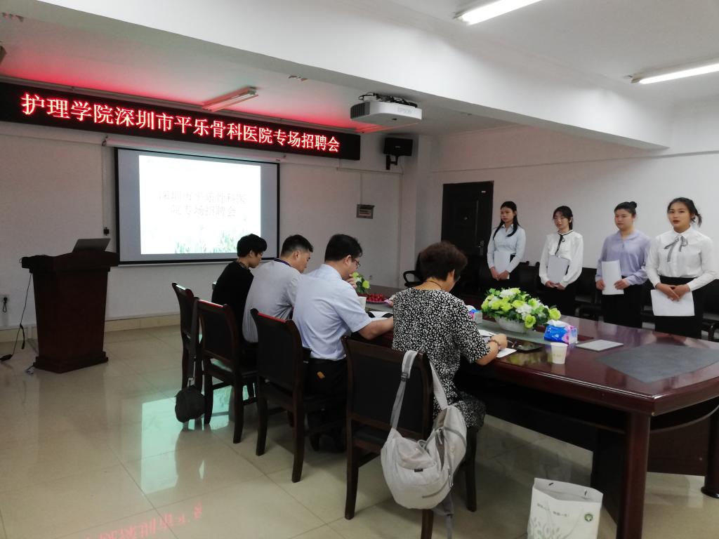 2019年5月15日上午9点,kaiyun体育官方网站登录在院会议室举行深圳市平乐骨科医院专场招聘会。深圳市平乐骨科医院四位老师、学生科裴芸老师及部分2019届应届毕业生参与此次招聘。