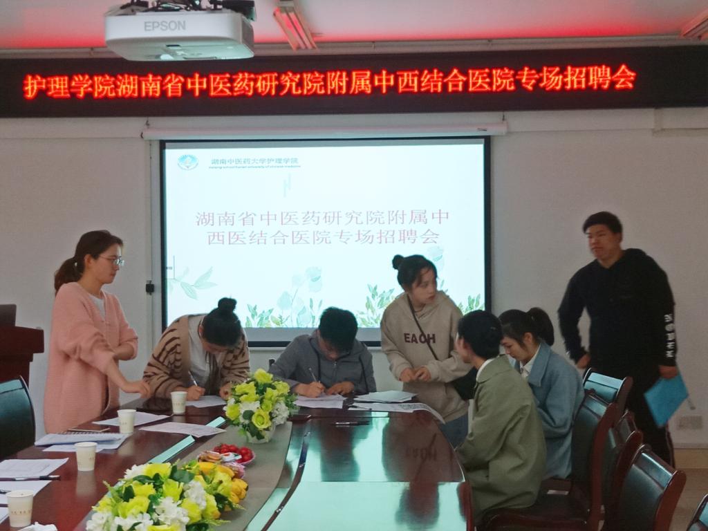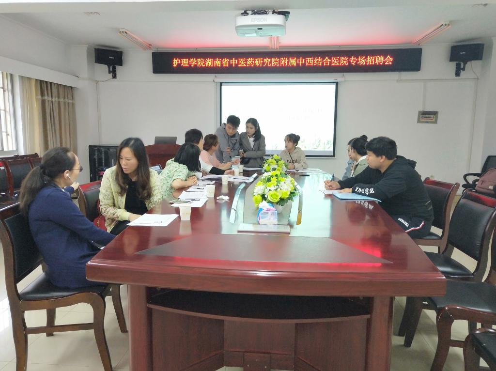 2019年5月15号下午14:30,kaiyun体育官方网站登录在会议室进行湖南省中医药研究院附属中西结合医院专场招聘会。活动参与人员为湖南省中医药研究院附属中西医结合医院五位老师、学生科裴芸老师及部分2019届应届毕业生。