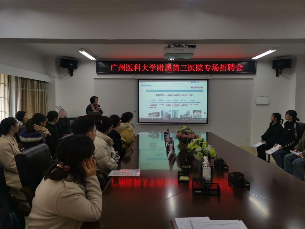 1月12日,广州医科大学附属第三医院来我院开展专场招聘会,我院积极动员组织学生参加了本次招聘会,广州医科大学附属第三医院内科湛献能护士长、内科总带教严诗玉老师参加了本次招聘,kaiyun体育官方网站登录副书记吴湘,学生科全体老师接待了招聘单位一行。本次专场招聘会吸引了护理专业学生共计40余名学生报名。本次招聘会初步确定了18名同学通过第一环节面试。