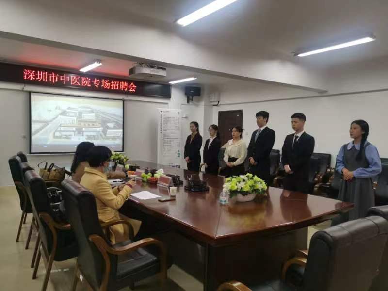 深圳市中医院护理部人事科的相关工作人员参加了本次招聘大会;招聘会开始前,我院领导接待了用人单位一行,并介绍了我院本届学生的总体情况、学生的成绩、获奖情况等;在评委老师和参加面试的同学们到齐后,专场面试会正式开始,同学们身着正装,自信昂扬地走进会议室并开始了面试招聘,等待的同学则在候场区准备着自己的面试,面试过程中,同学们沉着冷静,讲述自己的优点和特长,并列举了自己在校期间参与过的活动及取得的成绩。我院学子面对评委老师的提问,不慌不忙,回答条理清晰,逻辑清楚,赢得了评委老师们的一致好评。